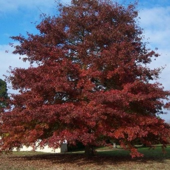 Дуб красный — в высоту достигает 300-400см,в диаметр 200-300см. с густой шатровидной кроной. Ствол покрыт тонкой, гладкой, серой корой, у старых деревьев растрескивающейся. Молодые побеги рыжевато-войлочные, однолетние — красно-бурые, гладкие. Листья глубоковыемчатые, тонкие, блестящие, до 15-20 см, с 4-5 заостренными лопастями с каждой стороны листа, при распускании красноватые, летом темно-зеленые, более светлые снизу, осенью, перед опадением, у молодых деревьев — шарлахово-красные, у старых — буровато-коричневые. Цветет одновременно с распусканием листьев. В молодом возрасте растет быстрее европейских дубов. Морозостоек. Предпочитает полное освещение верхушки кроны. Ветроустойчив, не очень требователен к плодородию почвы, выдерживает даже кислую реакцию, однако не выносит известковых и влажных почв. Устойчив к вредителям и болезням.
