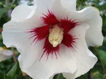 Гибискус сирийский «Shintaeyang» — декоративный кустарник с цветением удивительной красоты. Куст формируется вертикальными побегами, густо покрытыми темно-зелеными глянцевыми листьями. Цветение продолжительное, оно начинается поздней весной и продолжается почти до осени. Цветы крупные, с белоснежными лепестками и эффектной розовой сердцевиной. Высота взрослого куста — до 2 метров.
