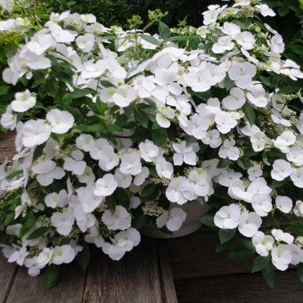 Гортензия ампельная Runaway Bride-очень оригинальный сорт, невысокий кустарник украшают необыкновенно прекрасные кружевные снежно-белые цветочки.