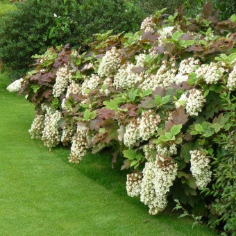 Гортензия дуболистная Snow Giant— очень стильный декоративный сорт гортензий имеет крупные соцветия-метелочки из мелких белых цветочков, собранных в конус. Растение очаровывает своей шикарной кроной, форма которой хорошо держится даже при неблагоприятных погодных условиях. Темно-зеленые листочки обеспечивают культуре изысканность даже при отсутствии цветов. Цветение начинается с июля длится до августа. Цветет на побегах прошлого и нынешнего года. Куст обильноцветущий, разветвленный высотой 90-100 см.