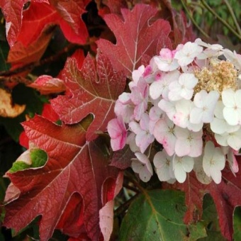 Гортензия дуболистная Snow Queen-превосходная гортензия. Листья привлекательные, тёмно-зелёные, длиной 20 см, шириной 15 см, 3-7 лопастные, напоминают листья дуба, осенью красные или бронзовые. Цветки вначале снежно-белые, затем розовеют. Соцветия красивые, метельчатые, длиной 20 см, с многочисленными плодущими и стерильными цветками. Цветёт в июне-августе. Кусты высотой 100-120 см. Побеги красноватые, войлочные.