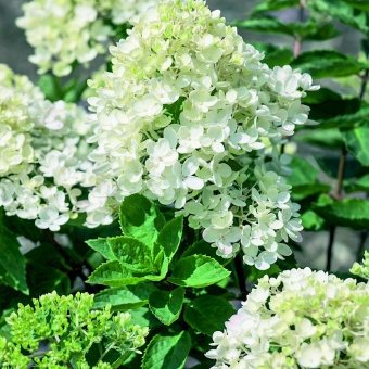 Гортензия метельчатая Bombshell- Один из самых обильно цветущих сортов гортензии. Цветки белые, многочисленные. Один из самых обильно цветущих сортов гортензии. Куст компактный, хорошо разветвлённый, аккуратный, округлой формы высотой и шириной 70-80 см. Побеги многочисленные красно-коричневые, тонкие. Листья темно-зеленые, довольно крупные, правильной яйцевидной формы с заостренной верхушкой и пильчатым краем, к осени желтеют. Соцветия обильные, плотные, округло-широкопирамидальные из стерильных цветков. Цветки белые, к осени розовеют, диаметром до 3-4 см с чашелистиками округлой формы. Соцветия высотой до 13 см и диаметром 11 см. Цветет с июля до середины сентября. Лучше всего растёт и обильнее цветёт на солнечных местах, выносит полутень. Отлично смотрится при одиночной посадке на газонах. Может выращиваться в составе ландшафтных композиций.