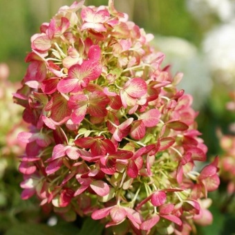 Гортензия метельчатая Graffiti-цветки меняют окраску в течение сезона. В начале они салатовые, затем зеленовато-розоватые, позже розово-красные с зелёными и белыми прожилками. Соцветия длиной 25-30 см, конические, состоят исключительно из стерильных цветков. Побеги прямостоячие, прочные. Цветение в июле-сентябрь. Соцветия подходят для срезки. Листья тёмно-зелёные, с обеих сторон опушенные. Куст высотой и шириной около 100- 110 см. рекомендуется для групповой посадки. Место солнечное или полутенистое. Почва влажная дренированная, слабокислая. Морозостойкость до -25ºС.