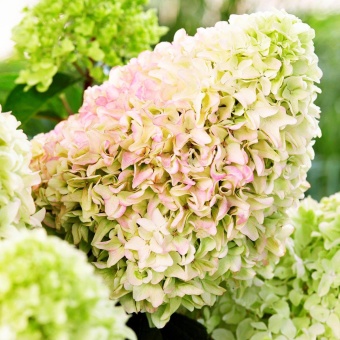 Гортензия метельчатая Little Fraise-куст очень компактный, высотой 50-120см. и диаметром 50-120см. Очень хорошо подходит для выращивания в контейнере на балконе или террасе. Цветки вначале кремово-белые и светло-зелёные, затем розоватые. Соцветия большие, плотные. Цветение в июле-сентябре. Листва мелкая, тёмно-зелёная. Место полутенистое или солнечное. Почва плодородная, влажная, дренированная. Морозостойкость до -25°С.