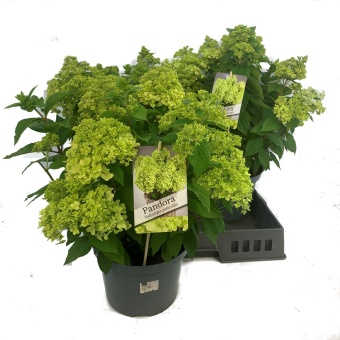 Пандоры отличаются малогабаритностью. Их высота колеблется от 100-150 см. Ширина составляет примерно 100-110 см. Кроме округлой формы кроны, эта культура может похвастаться завидной прочностью побегов. Примечательна листва такой гортензии. Она удлинена и отличается легкой зазубренностью. Для листьев типичен простой темно-зеленый окрас.