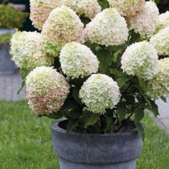 Гортензия метельчатая Summer Love — в высоту достигает 100-120, в диаметр 80-100см. Одна из самых красивых разновидностей. Представляет собой изящный, компактный куст. Корневая система поверхностная: ткани быстро впитывают воду и питательные вещества, благодаря чему куст растет очень активно. Поэтому он может зацвести уже в первый год после посадки. Многочисленные цветки белого и светло-розового цвета соединяются в пышные метелочки, которые появляются в больших количествах с середины до конца лета. Длина соцветия до 30-35 см, по форме они шаровидные и конусообразные. Крона гортензии Саммер Лав шарообразная, ветви крепкие, растет довольно плотно, листва темно-зеленых оттенков. При этом листья имеют овальную форму, их кончики заострены, однако во время цветения они практически не видны. Небольшая высота куста позволяет отнести гортензию Саммер Лав к низкорослым видам.