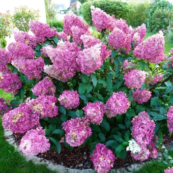 Гортензия метельчатая Sunday Fraise — в высоту достигает 120-150см., в диаметр 120-150см. У гортензии Сандей Фрайз листья темно-зеленые, длинные, до 12 см. Цветы, диаметром 2,5 см, собраны в крупные, до 35 см в длину, пирамидальные соцветия. Сначала они окрашены только в белый цвет, но позже появляется розовый оттенок, а ближе к окончанию цветения — ярко-малиновый. Период цветения довольно долгий – с июня по октябрь. Благодаря невысокому росту гортензию Sundae Fraise можно использовать в ландшафтном дизайне для озеленения даже самых маленьких участков, создания оригинальных живых изгородей, а также в комбинации с другими кустарниками и цветами.
