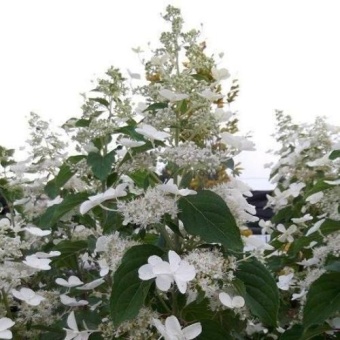 Гортензия метельчатая White Goliath- декоративный кустарник высотой 100-110 см с прямостоячими не разветвленными крепкими побегами красно-коричневого цвета. Листья крупные, с выемчато-пильчатым краем, заостренной вершиной, неравнобоким основанием, широко-ланцентной формы. Цвет у листьев изумрудно-зеленый, сидят они на очень ярких черешках вишневого цвета, что придает особую декоративность даже не цветущему растению. Относится к позднецветущим сортам. Зацветает в конце июля начале августа и цветение продолжается до конца сентября. Соцветие метелка узкой конусной формы, состоит из стерильных и фертильных цветков, которых большинство – около 70% . Окраска цветов белая, к осени может приобретать палево-розовые тона. Фертильные цветки имеют длинные тычинки, махровые цветки, раскрываются дружно и соцветие выглядит объемным и воздушным. Особый шарм придают крупные, актиноморфной формы стерильные цветки, сидящие на длинных цветоносах, создавая эффект кружева. Удивительно неприхотливое растение, хорошо растет как на открытых участках, так и в полутени. Зимует без укрытия.