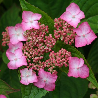 Гортензия пильчатая Avelroz-до 80-100 см в высоту с крупными шаровидно-уплощенными соцветиями. Отличается красивой фиолетово-зеленой листвой и прекрасными цветами. Ширина около 80 см. В июне и июле покрыта многочисленными, элегантными, плоскими, слегка зонтиковидной формой соцветий с темно-розовыми плодоносящими цветами окруженными по краям стерильными ярко-розовыми цветами, цвет становиться более синим в кислой почве. Цветет с начала лета до сентября.