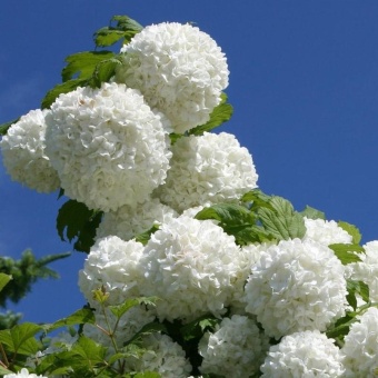 Калина обыкновенная Roseum- кустарник высотой до 4 метров и диаметром около 3-х м. Форма и окраска листа: листья зелёные, осенью оранжево-красные. Шаровидные соцветия, изначально зеленовато-белые, затем белые. Цветёт в мае, в начале июня, не плодоносит. Растёт быстро. Предпочитает достаточно увлажнённые почвы, от нейтральных до сильно щелочных. Растет на солнце и в полутени. Морозостойка. Используется для оформления больших садов и парков.