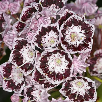 Кальмия Black Label – образец неповторимого творчества природы, отобразившей в узоре цветков принцип инь и ян. Необычайно красивые цветки диаметром около 3 см кажутся фарфоровыми.. Они собраны в крупные соцветия-зонтики, которые появляются на концах побегов и в мае — июне и покрывают нарядной шалью весь куст .На одном кусте могут находиться около 200 соцветий. Сросшиеся лепестки чашечки цветка создают неповторимый узор-звездочку из белого и черного (коричневого) цветов. Этот вересковый американский кустарник вырастает в высоту до 130 см. Растет не быстро. Имеет прямостоящие густые красные побеги с темно зелеными кожистыми листьями.