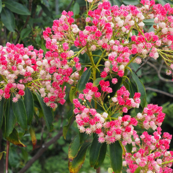 Цвет цветков в бутонах изначально белый, со временем меняющийся от розового до красного. Окрас раскрытых цветков бледно-розовый.