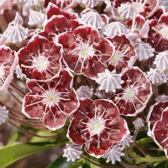 Кальмия широколистная «Tad» — цветущий, раскидистый кустарник с вечнозелеными листьями. Округлая форма кроны формируется прочными, вертикальными побегами. Листва ланцетовидная, насыщенного зеленого оттенка. Цветение начинается в мае, оно обильное, пышное, продолжается в течение нескольких недель. В этот период появляются крупные соцветия, состоящие из 130-140 мелких цветов эффектной окраски. Основной цвет лепестков красно-пурпурный, по краю идет красивая белая каемка, белые точки украшают цветок в сердцевине, у тычинок. Ширина куста — до 90 см, высота —100-120 см.