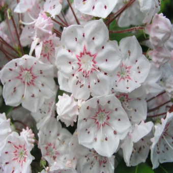 Кальмия широколистная Zebulon — цветущий, раскидистый кустарник с вечнозелеными листьями. Округлая форма кроны формируется прочными, вертикальными побегами. Листва ланцетовидная, насыщенного зеленого оттенка. Цветение начинается в мае, оно обильное, пышное, продолжается в течение нескольких недель. В этот период появляются крупные соцветия, состоящие из 130-140 мелких цветов эффектной окраски. Основной цвет лепестков белый с пурпурными точка. Ширина куста — до 90 см, высота —100-120 см.