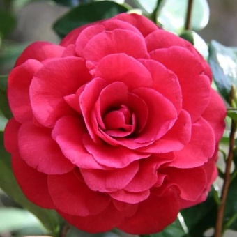 Камелия японская Леди Кэмпбелл – утонченное растение для выращивания в зимнем саду или теплице. Куст мощный, ветвистый, побеги густо покрыты насыщенно-зелеными крупными листьями с глянцевой поверхностью. Вечнозеленая камелия никогда не сбрасывает зеленый убор. Цветы крупные, махровые, диаметром от 7 до 10 см. Окраска лепестков варьируется от темно-розового до красно-бордового оттенка. Период цветения – с марта по май.