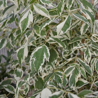 Клен ясенелистный Variegatum — в высоту достигает 150-200см, в диаметр 150-200см. Дерево или кустарник. Двудомное растение. Ежегодный прирост в высоту 25 см, в ширину 15 см. Кора серая. Крона ажурная. Листья длиной до 10 см сложные, состоят из 3-5 листочков при распускании розовых, затем неравномерно-зеленых с широким белым окаймлением. Осенняя окраска листьев желтовато-зеленая. Плоды серые крылатки. К почве нетребователен. Используется как ординар, в группах, аллеях, живых изгородях.
