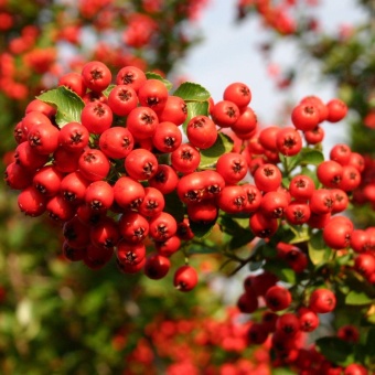 Пираканта узколистная Red Column-колючий вечнозеленый кустарник пираканта (Pyracantha) является представителем семейства Розовые. В природе такое растение встречается в южной части Европы и в Юго-Восточной Азии. Название «пираканта» произошло от пары греческих слов, переводящихся как «огонь» и «колючка». Если перевести название данного рода, то получится «колючее растение с огненно-красными плодами», либо «огненный шип».