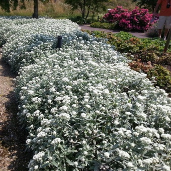 Анафалис трехжилковый ‘Silver Wave’ — Многолетнее, пряморастущее, компактное растение высотой до 50 см. Листья ланцетные, сильноопушенные, серовато-зеленые. Цветет продолжительно, с июля по сентябрь. Серебристо-белые цветки собраны в соцветия на концах побегов. Предпочитает полутень, однако хорошо развивается и на солнечных участках. Не требователен к составу почвы. Он не должен быть слишком сухим. Кислотность – нейтральная. Он отлично растет на каменистых почвах. Растение хорошо подходит для высадки в рокариях и альпийских горках, зеленых бордюрах, дополняет композиции с использованием хвойных растений и низкорослых лиственных кустарников.