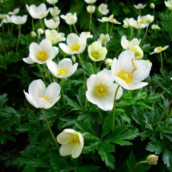 Анемона лесная «Snow White» распускается чисто-белыми чашевидными цветками с жёлтыми тычинками диаметром 4-5 см. Цветки блестящие, слегка ароматные, расположены одиночно на стеблях. Листья глубоко-лопастные нежно-зеленого травяного цвета. Высота растения 25 см, цветоносы поднимаются над кустом до 50 см. Это красивейшее растение еще можно встретить на наших лугах и в лесах.