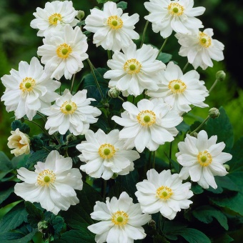 Анемона японская Whirlwind-многолетнее травянистое растение. Растения имеют ползучее, горизонтально располагающееся корневище и прямой стебель высотой до 90 сантиметров. Тройчатые, разделенные на лопасти листья опушены серыми ворсинками. Крупные белые цветки диаметром до 8 сантиметров образуют большие и пышные соцветия. Цветение: сентябрь — октябрь. Цветки анемоны великолепно выглядят в композиции с астильбой, астрой, осеннецветущим аконитом, клопогоном ветвистым. Предпочитает солнечные места или легкую полутень. Морозостойка.
