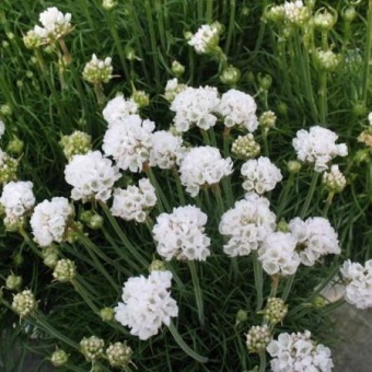 Армерия приморская Armada White — многолетнее подушковидное растение 15 см высотой и 15 см в поперечнике, с узкими, линейными, плоскими, тупыми сине-зелеными листьями. Цветки белые, собраны в головчатые соцветия, прикрытые пленчатыми прицветниками. Цветоносы до 20 см высотой, опушенные. Цветет с мая около 70 дней, иногда повторно осенью. Требует яркого солнечного освещения и очень хорошо дренируемых почв. Используется для посадки в рокариях небольшими группами. Может применяться для озеленения крыш.