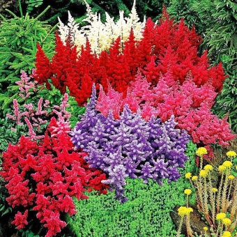 Самыми популярными соседями по клумбе для астильбы являются папоротники, ирисы сибирские и хосты. Однако, не стоит ограничиваться таким малым набором растений. Сочетание астильбы с некоторыми сортами герани или колокольчиками будет не менее эффектным. Можно разбавить ею клумбу с первоцветами или некоторыми низкорослыми многолетниками.
