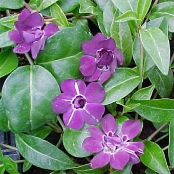 Отличный почвопокровный ползучий полукустарник для полутенистых и солнечных мест, h=15 см, шир.50 см, хорошо растёт под деревьями, покрывая землю сплошным плотным ковром, может использоваться для укрепления склонов и как ампельное растение для подпорной стенки, цветки махровые, пурпурно-синие, цветёт в мае-июне, листья кожистые, блестящие, зелёные, зона 4 (до -29°С).
