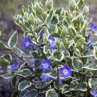 Барвинок малый Variegata – морозоустойчивое, неприхотливое растение. Для начинающих любителей цветов – лучший выбор, не требует соблюдения специальных условий посадки и правил содержания. Растение имеет голубые цветки, темно-зеленые листья, длинные побеги. Активная фаза цветения Variegata приходится на конец весны – начало лета. Впрочем, листья остаются зелеными круглый год и будут продолжать участок, кроме того, в конце лета возможно второе цветение растения.