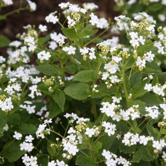 Бруннера крупнолистная Betty Bowring — многолетнее, крупнолистное растение. На одном месте может расти до 10 лет без пересадки. В высоту кустарник достигает 50 сантиметров, в диаметре 60 сантиметров. Хорошо переносит любую погоду. Бруннера зацветает в мае месяце, образуя маленькие пятилистные цветки белого цвета. Внешне есть сходство с незабудкой. Широко применяется в ландшафтном дизайне. Отлично смотрится как в одиночных посадках около дома, так и в групповой посадке с другими сортами бруннеры.