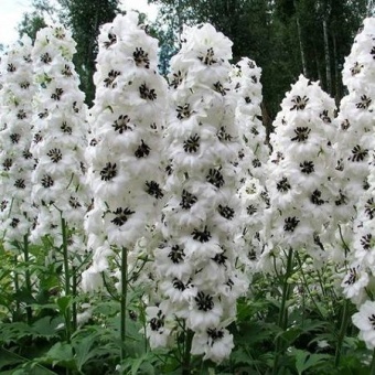 Рассада дельфиниума Вайт виз Дарк Би (Magic Fountains White with Dark Bee) – это многолетнее растение, которое достигает высоты около 150 см. Листики пальчато-рассеченной формы. Цветки большие, полумахровые около 2-3 см в диаметре. Цвет цветения белый с черным центром. Цветет в июле -август. Плюсы дельфиниума Вайт виз Дарк Би — неприхотлив — зимостоек — своеобразное цветение Семена дельфиниума Вайт виз Дарк Би нужно садить в солнечном месте, желательно защищенном от ветра. Подходит для декорирования стен, в сборных цветниках. Красиво смотрится одиночно на фоне газона или возле беседок.