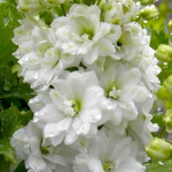 Рассада дельфиниума культурного Джайант Галахэд вырастает до двух метров, имеет длинные цветоносы, которые в сезон цветения (с середины июня до начала осени) покрываются крупными белоснежными цветками, которые образуют пирамидальные соцветия-свечки. Сорт Джайант Галахэд относится к тихоокеанским гибридам дельфиниума, и лепестки и сердцевина цветка у него белоснежная. Дельфиниумы хорошо переносят холода, и даже морозы вплоть до -40 градусов. Однако застой влаги в корнях, который может образоваться во время оттепели, для растения губителен. Семена перед высеванием необходимо выдержать в холоде, этот процесс называется стратификация.