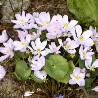 Джефферсония двулистная – мощный, не расползающийся куст. Взрослый экземпляр достигает 50 см высотой. Корневая система джефферсонии двулистной компактная с многочисленными мочковидными корешками. Цветки этой джефферсонии на цветоносах 30 см в высоту. Цветет в мае, когда листва еще не полностью сформирована. Цветки небольшие, бело-лиловые, 2–3 см диаметром. Цветет джефферсония двулистная недолго, примерно неделю.