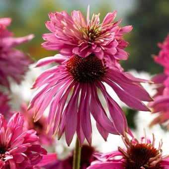 Совершенно уникальный сорт. На вершине темно-коричневого конуса распускается второй ряд розовых язычковых цветов, поменьше, чем нижний ряд длинных, пурпурно-розовых лепестков. Двурядность развивается не у всех соцветий, даже на одном растении. Размер цветка 8-10 см. Высота куста 70-90 см. Цветение начинается в середине лета и продолжается в течение нескольких недель. Цветы очень привлекательны для бабочек.