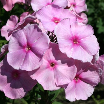 Цветки колесовидные,диаметром 4–4,5 см, бледно-розовые с розовым глазком не выгорают на солнце. Обладают изысканным ароматом.