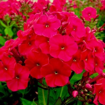 Средние по размеру пятилепестковые цветки достигают в диаметре 3,5 см. Цвет лепестков красно-малиновый, ближе к центру цветка может появляться фиолетовый тон. Махровость не наблюдается. Цветы источают душистый аромат, облаком поднимающийся над кустом.