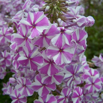 Флокс пятнистый ‘Natascha’. Диаметр цветка 1,5–2,0 см; высота 70–80 см. Белый с сиренево-малиновой полоской по центру лепестка, слегка выгорает. Соцветие цилиндрическое, высокое, плотное.