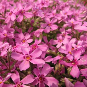 Розовый цветок с малиновым глазком, звездчатый, диаметром 2,5 см. Цветение обильное, в мае — июне, цветки собраны в небольшие щитковидные соцветия, высотой до 15 см. Растение травянистое, многолетнее, 5 — 8 см высотой. Образует довольно плотный ковер из нецветущих стеблей. Листья маленькие, удлиненно-овальные, зимующие, жесткие, острые, длиной 2 см. Лежачие стебли укореняются в узлах, и в этом месте также появляются побеги, несущие по 1 — 2 цветочных кистей. К заболеваниям устойчивость высокая, морозостойкий сорт, предпочитает сырые, тенистые места, и рыхлые, плодородные почвы.