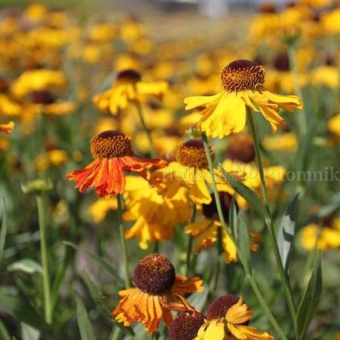 Гелениум Fata Morgana — сорт гелениума с полумахровыми краевыми цветками. Высота куста 70–100 см. Эффектные крупные соцветия – это всполохи абрикосового цвета на фоне золотистых краевых лепестков и коричневой серединки. Период цветения охватывает июль-сентябрь. Выносит затенение, но цветение в таких условиях менее интенсивное.
