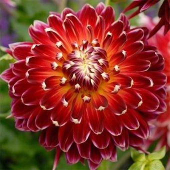 Георгина Akita — один из наиболее эффектных сортов из серии гигантских георгин. Она цветет в период с июля по сентябрь крупными пышными цветами ярко-красного цвета с желто-кремовыми переходами. Диаметр цветка при роспуске достигает 20-25 см. Продолжительность великолепного цветения 15-20 дней. Высота прочных стеблей георгины Акита около 90 см, причем они не требуют опоры, а листья нежные, темно-зеленого оттенка. В срезке цветоносы георгины устойчивы, великолепно смотрятся в комбинированном букете.