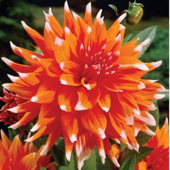 Георгина Color Spectacle один из красивейших сортов — цветы состоят из оранжевых широких лепестков, кончики которых окрашены белым. Кусты отлично смотрятся в одиночных, групповых и смешанных посадках. Сорт подходит для составления букетов, оформления бордюров, окаймления клумб и украшения мест отдыха. Цветение начинается в июле и длится до осенних заморозков. Для посадки луковиц георгины Color Spectacle рекомендовано выбирать участки с хорошим освещением, но защищенные от ветра. Взрослый куст вырастает до 100 сантиметров в высоту, а в ширину достигает полуметра.