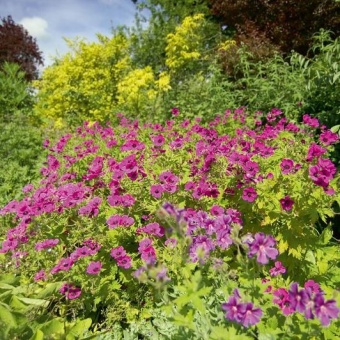 Саженцы герани Анн Фолкард (Ann Folkard) — это один из лучших сортов с яркими цветками. Растение будет расти в большинстве почв при наличии хорошего дренажа. Предпочитает солнце или полутень, но также будет терпеть и полную тень (с плодородной влажной почвой). Окраска цветов пурпурно-малиновая с темными прожилками и с черным «глазком» в центре. Листья глубоко-рассеченные, очень декоративны. Их окраска в начале золотистая, а потом приобретает желто-зеленый оттенок. Кустик раскидистый, требует много места на клумбе. Саженцы герани Анн Фолкард можно располагать в центре или на краю цветника, и вдоль дорожек.