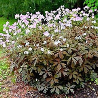Рассада герани пятнистой Espresso (Эспрессо) отличается необычной листвой, похожей на резные шоколадки. Осенью цвет листиков становится золотистым, а в сочетании с повторно зацветающими соцветиями вид растения очень декоративен. Высота круглого аккуратного куста в среднем 30-40 см, чашечки цветов розово-лавандовые миниатюрные. Быстро растет, может притеснять окружающие растение, нужно удалять лишние побеги. Семена из коробочек разлетаются широко.