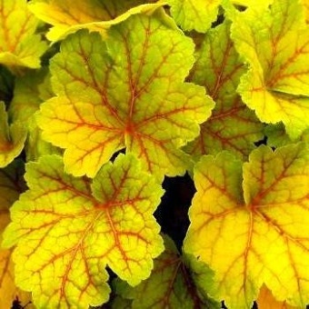 У гейхеры Электра листья ярко-желтые с контрастными красными прожилками весной и зеленовато-желтые летом. Красные прожилки остаются постоянно, независимо от времени года. Цветки белые, цветоносы невысокие. Цветет в мае-июне.