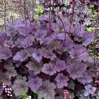 У этого сорта очень эффектные матово-бархатистые, зазубренные листья насыщенные фиолетово-розовые, к концу сезона приобретают с сливово-пурпурные оттенки. Прожилки широкие и темные. Рисунок между тёмных жилок плохо передается на фото. В тени приобретает зеленоватые и темно-пурпурные цвета. Цветы светло-кремовые собраны в рыхлые соцветия. Цветоносы высокие до 35 см. Цветет в июне-августе.