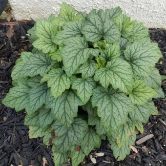 Гейхерелла Блю Ридж-многолетний кустарник. Листва серебристо-зеленая с широкими бордовыми прожилками , в начале сезона с массой белых цветов.