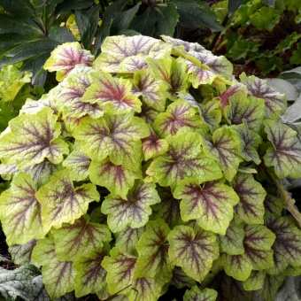 У гейхереллы Fire Frost листья округлые, широкоовальные, светлые зелено-желтые, с темно-бордовым центром. Поздним летом внутренняя поверхность листовой пластины покрывается белой вуалью. Над розеткой пестрой листвы возвышаются белые пенистые цветы на цветоносах высотой до 50 см. Цветет июнь-август.