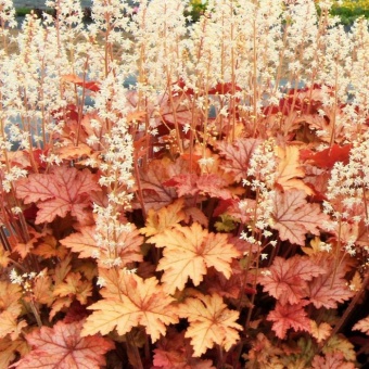 У Гейхерелла Хани Роуз фантастическое изменение цвета. Крупные апельсиново-розово-бежевые листья весной, и бронзовые летом. Темные прожилки и затейливые узоры добавляют великолепия глубоко надрезанной листве. Соцветья метельчатые на низких цветоносах. Цветет обильнее и продолжительнее (до двух месяцев) других гейхер, в мае – июне.