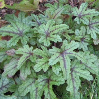 Саженец необходимо разместить на глубину 5 см. При массовой посадке расстояние между саженцами не должно быть меньше 30 сантиметров.В целом, гейхерелла – очень неприхотливое растение.Чтобы цветение было интенсивнее, можно вносить минеральные удобрения один раз в год (весной). Также важно поливать растение.Широкие гладкие листья. Окрас оливково-желто-зеленый, на поверхности видны бордовые прожилки.
