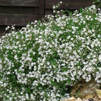 Гипсофила ползучая «Filou White» цветет обильно и непрерывно на протяжении всего лета. Цветки – простые пятилепестковые чашечки ослепительно белого цвета с зеленоватой серединкой, располагаются на верхушках прямостоящих побегов. Образуют сплошное, воздушное облако, разбавленное изумрудной остроконечной листвой. Куст выглядит легко, изящно, декоративно. Высота взрослых экземпляров – 20 см.