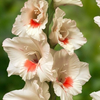 Луковицы гладиолуса гибридного Аджакс с наступлением теплой погоды и прогреванием грунта высаживают на открытых солнечных местах. Предпочтительные грунты — песчаные и супесчаные, лунки мульчируйте органикой. Сорт характерен высокими прямостоячими стеблями, высотой до 1 метра, длинными мечевидными листьями. Соцветие образуется двумя рядами цветов молочно-белого или бежевого тона с яркими кровавыми мазками в центре. Края лепестков украшает широкая гофрированная кайма.